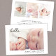 Anuncio de nacimiento mínimo y neutral de género con la foto de su bebé mostrada con "hola" en un sencillo guión y su nombre, fecha de nacimiento y estadísticas de nacimiento en la tipografía moderna. En la parte posterior, agregue tres imágenes adicionales y un mensaje personalizado.