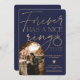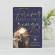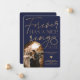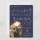 Forever tiene un bonito anillo, Relieve metalizado de oro de escritura moderna y invitación de compromiso azul marino con un ilustracion de anillo de compromiso. Todos los colores son editables.