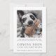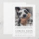 Funny dog photo coming soon design featuring a playful pup proudly holding a toy and the humorous phrase “I thought I was the baby but now you’re adding one more to the pack.” Told from the dog’s perspective, the message captures the moment when the family pet realizes their role as the household baby is about to change. The clean layout keeps the focus on the expressive dog photo, paired with a bold Coming Soon headline and space for parents’ names and baby’s arrival date. A playful way to share the news that your family is growing and the pack is getting a new little member. Available in print, as a digital download or both.
