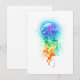 Grandes medusas de azulejo brillantes, de dibujos artísticos, con largos tentáculos en blanco, pintadas con fondo multicolor de acuarela. Mariscas arcoiris.