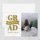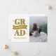 Gold and white graduation with class year inside a banner ribbon and decorative star accent. Photo template via Pixabay licensed under CC0 and must be replaced with your own photo.