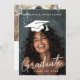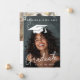 Invitación de graduación con un gorra de graduación blanco como superpuesto sobre tu foto. Puede mover, cambiar el tamaño y rotar el gorra en la herramienta de diseño.