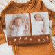 Extraordinaria tarjeta de anuncio de natalidad con texto de tipografía que dice "gracias" en la parte inferior con dos fotos en la fuente. Puede añadir una tercera imagen en la parte posterior junto con las estadísticas de nacimiento y el mensaje. el fondo es terracota.