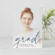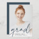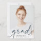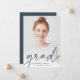 La moderna invitación de graduación para tu clase de 2022 grad incluye una foto vertical/retrato orientada, con "grad" en la parte inferior con letras manuscritas azul polvoriento oscuro. El nombre del graduado y la escuela aparecen en la parte inferior. Añade una invitación personal a la parte posterior, junto con una foto adicional.
