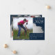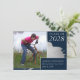 Plantilla de graduación moderna con un superpuesto fotográfico para anunciar el logro de tu graduado de secundaria o universitario de 2019 con estilo en una simple paleta artística azul marino, blanco y gris plateado. El diseño artístico masculino presenta mancha de pintura abstracta monocromática con 2 fotos y letras de moda con el nombre del graduado, la escuela y el año de graduación. Clases obligadas de 2019