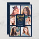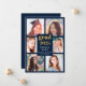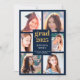 Envíe a su familia y amigos una tarjeta de graduación de collage de fotos personalizada para que la miren. Este moderno diseño de plantilla incluye seis fotos para que cambies a tu propio marco en azul. En el centro de la tipografía en oro y blanco está la palabra "Grad" con el año, tu nombre y escuela para personalizar. La parte trasera de la tarjeta es azul. Diseñado por Susan Coffey.
