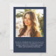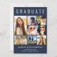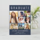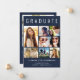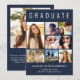Moderna invitación de graduación azul oscuro con "GRADUATE" en letras blancas grandes, un collage de siete fotos y el nombre del graduado, el año de clase y la escuela en tipografía blanca moderna. En la parte posterior, añada una foto adicional y un mensaje personalizado.