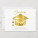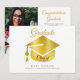 Con una gorra de graduación dorada y elegante, esta tarjeta de anuncio de graduación moderna se puede personalizar con los detalles de su celebración y una foto especial en el reverso. Diseñada por Thisisnotme©