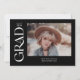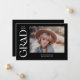 Esta elegante invitación de graduación presenta la palabra grad en un serif de moda blanca a la izquierda. La parte delantera tiene espacio para una foto de la graduación, así como su nombre, año de clase y colegio. La parte trasera de la invitación tiene espacio para una segunda foto y un mensaje corto.