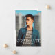 Tarjeta de invitación para graduación de niños moderna con un diseño simple y masculino con "Graduado" en tipografía en negrita junto con el nombre del graduado, año y escuela sobre su foto vertical favorita de sangrado completo. El reverso tiene una imagen cuadrada con su mensaje personal debajo en una fuente serif azul marino sobre un fondo blanco.