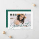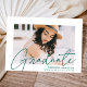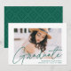 Celebra el grado con nuestra elegante invitación de graduación de fotos. La invitación de graduación muestra la foto del graduado con "Graduado" en un overlay de caligrafía moderna y verde. Personalice el frente de la moderna invitación de graduación agregando el nombre del graduado, el nombre de la escuela y el año de graduación. La invitación se revierte para mostrar una tendencia geométrica punteada en blanco y verde a la moda. El diseño es perfecto tanto para graduados de secundaria como universitarios.