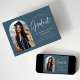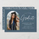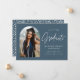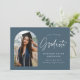 Invitación de graduación de moda con la foto del graduado enmarcada por un arco azul de acero oscuro con "Graduado" en un guión escrito a mano en blanco. Personalice la parte delantera de la tarjeta de invitación de graduación del arco agregando el nombre del graduado, el año de graduación, el nombre de la escuela y los planes futuros. La invitación de graduación fotográfica se invierte para mostrar un patrón de punteado de acero azul y blanco. La invitación es apropiada tanto para los egresados de la escuela secundaria como para los universitarios.