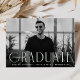 Simple invitación de graduación con la foto horizontal del graduado con "Graduado" exhibida en letras verdes de menta, arte moderno y de diseño. Personalice la parte delantera de la invitación de graduación con fotos agregando el nombre del graduado, la escuela y el año de postgrado. La invitación se invierte para mostrar un diseño geométrico de giratoria verde y blanco.