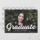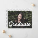 Invitación de graduación simple y elegante con la foto horizontal del graduado con "Graduado" en un audaz guion blanco. Personalice la invitación de graduación fotográfica añadiendo el nombre del graduado, el nombre de la escuela y el año de graduación. La invitación se invierte para mostrar un patrón de arco geométrico en blanco y negro.