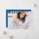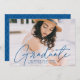 Celebra el grado con nuestra elegante invitación de graduación de fotos. La invitación de graduación muestra la foto del graduado con "Graduado" en un overlay de caligrafía azul moderno. Personalice el frente de la moderna invitación de graduación agregando el nombre del graduado, el nombre de la escuela y el año de graduación. La invitación se revierte para presentar un diseño geométrico punteado en blanco y azul a la moda. El diseño es perfecto tanto para graduados de secundaria como universitarios.