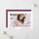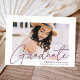Celebra el grado con nuestra elegante invitación de graduación de fotos. La invitación de graduación muestra la foto del graduado con "Graduado" en un overlay de escritura de caligrafía violeta y moderna. Personalice el frente de la moderna invitación de graduación agregando el nombre del graduado, el nombre de la escuela y el año de graduación. La invitación se revierte para presentar un diseño geométrico punteado en blanco y violeta a la moda. El diseño es perfecto tanto para graduados de secundaria como universitarios.