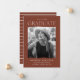 ¡Celebra el gran hito de tu graduación con estos modernos anuncios de graduación fotográfica! El diseño presenta el año de graduación en la parte superior con el "Graduado" mostrado abajo con letras blancas modernas. La foto del graduado se muestra dentro de un marco marrón con bordes rotos. Personalice la invitación añadiendo el nombre del graduado, el nombre de la escuela y los planes futuros (universidad, ejército, elección de carrera, etc.). La tarjeta se invierte para mostrar un patrón de rayas marrón y blanca texturado.