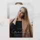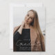Anuncie los logros y planes de tu graduación con esta elegante y moderna invitación de graduación fotográfica. La parte delantera de la invitación muestra la foto vertical de sangre completa del graduado. "Graduado" se muestra en un guión rosa rosa de color negro, moderno y escrito a mano. Personalice la invitación con el año de graduación, el nombre del graduado y el nombre de la escuela. La invitación se invierte para mostrar una foto adicional con el texto de su personalizado debajo en letras negras con un fondo rosa rubor sólido. Esta invitación de graduación fotográfica es perfecta para graduaciones de secundaria o universitarias.