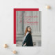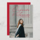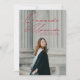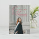 Moderna invitación de graduación que presenta la foto vertical del graduado con "Hacia adelante y hacia arriba" en un guión escrito a mano en rojo. Personalice la parte delantera de la invitación de graduación fotográfica agregando el nombre del graduado, la escuela y el año de graduación. La invitación se revierte para mostrar una foto adicional con los planes futuros del graduado, detalles del fiesta de grado, etc. mostrados a continuación.