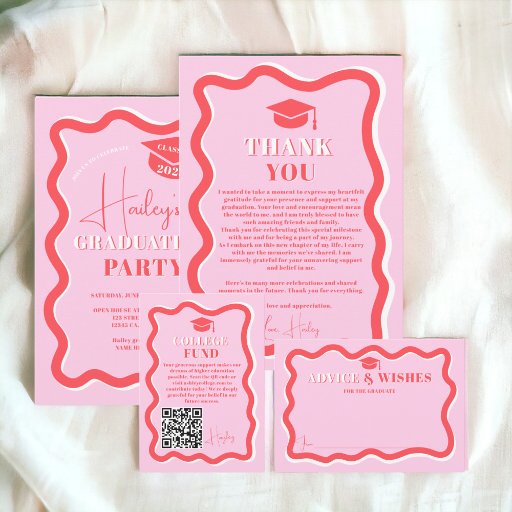 Una genial invitación a la invitación de graduación de nombre en negrita con una foto ondulada de la curva roja retro. Todos los colores del texto, los nombres y el fondo son personalizables.