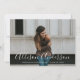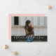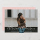 Elegante invitación de graduación que presenta la foto horizontal del graduado y el nombre del graduado en un overlay de escritura de caligrafía blanca. Personalice la invitación de graduación fotográfica añadiendo el nombre de la escuela y el año de graduación. La invitación se invierte para mostrar un patrón de enrejado blanco y un fondo rosado de color.
