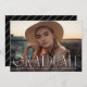 Anuncie su graduación con estilo con nuestros modernos anuncios de graduación fotográfica. Los simples anuncios de graduación incluyen tu foto preferida horizontal senior con "Graduado" mostrado en un texto blanco moderno. Personalice la parte delantera de los anuncios de graduación de moda agregando el nombre del graduado, el nombre de la escuela y el año de graduación. La tarjeta se invierte para mostrar un diseño rayado en blanco y negro.