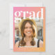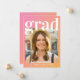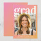 Tarjeta de invitación de graduación rosa y naranja de moda con una foto del grado, "grad" con una gran letra blanca en negrita y su nombre, año escolar y de clase en una simple tipografía blanca moderna.