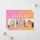 Tarjeta de invitación de graduación de moda con fondo de degradado rosa a naranja, tres fotos del grado, "graduado" en elegante escritura blanca con toques y su nombre, escuela y curso de clase en una simple tipografía blanca moderna.