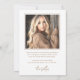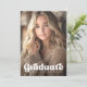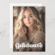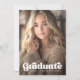 Invitación de graduación en blanco o de cualquier color con una foto completa en el frente con texto blanco superpuesto "graduado" en un frente de estilo retro. A continuación se muestra una plantilla archivada para el nombre y año del graduado u otro texto personalizado. Mensaje de personalizado y foto adicional en la parte posterior.