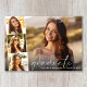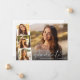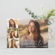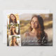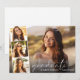 Elegante tarjeta plana de invitación de graduación con la foto del graduado rebosante con una tipografía blanca simple con tres fotos cuadradas más pequeñas y un "graduado" con un delgado guión blanco moderno y su nombre y año de clase.