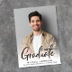 Moderna invitación de graduación con la foto del graduado mostrada con "Graduado" en un guión en negrita contemporáneo. Añada su nombre, año de clase y escuela en una tipografía simple.