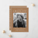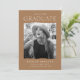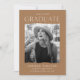 ¡Celebra el gran hito de tu graduación con estos modernos anuncios de graduación fotográfica! El diseño presenta el año de graduación en la parte superior con el "Graduado" mostrado abajo con letras blancas modernas. La foto del graduado se muestra dentro de un marco de color tostado con bordes rotos. Personalice la invitación añadiendo el nombre del graduado, el nombre de la escuela y los planes futuros (universidad, ejército, elección de carrera, etc.). La tarjeta se invierte para mostrar un dibujo texturizado y rayas blancas.