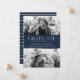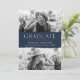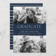 ¡Celebra el gran hito de tu graduación con estos modernos anuncios de graduación! La invitación de graduación de dos fotos muestra "Graduado" en el centro del diseño con letras blancas modernas y fondo marino con bordes rotos. Personalice la invitación agregando el nombre del graduado, el nombre de la escuela y el año de graduación. La tarjeta se invierte para mostrar un patrón de navío texturado y rayas blancas.