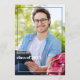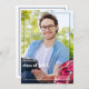 Una carta de invitación a los graduados, única y de moda, enmarcada con un elegante patrón de invitación azul oscuro y blanco. Con espacio para el personalizar o personalización con una foto, el nombre del graduado, el año de graduación de clase, la escuela secundaria, el futuro nombre de la universidad o universidad, e información sobre eventos de fiestas de celebración. Que la familia, amigos y vecinos sepan que hay un feliz graduado listo para conquistar el mundo, ¡e inviten a todos a venir a celebrar el feliz evento contigo!