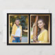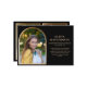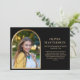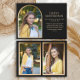 Elegante y moderna invitación de graduación de personalizado negro y dorado para la Clase de 2025 (o cualquier año). Esta tarjeta está diseñada tanto en la parte delantera como en la trasera. La parte delantera de la tarjeta tiene una foto en forma de arco, nombre del graduado, nombre de la escuela, año de graduación, y detalles de logros y/o planes para el futuro. La parte posterior de la tarjeta le permite añadir dos fotos más enmarcadas en oro.