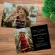 Esta moderna y elegante tarjeta de invitación de graduación es una plantilla radiante diseñada para celebrar el brillante futuro de su graduado. Esta invitación capta la alegría del graduado y la expectativa por el viaje que se avecina mientras se preparan para la siguiente etapa emocionante de sus vidas. En el frente, una fotografía del graduado con el texto "Felicitaciones Graduado", el nombre del graduado, el nombre de la escuela y el año de clase en una combinación de elegante escritura a mano y modernos tipos de letra serif, permite un toque personal que habla directamente de este hito. Voltea hacia la parte trasera de la invitación, y la narrativa se profundiza. Aquí se encuentra una segunda fotografía complementada por una invitación sincera con los detalles de la graduación y los planes futuros establecidos en un fondo negro clásico, dándole a la carta un toque de sofisticación y haciendo que el texto blanco aparezca con claridad. Esta tarjeta no es solamente un aviso de graduación —es un recuerdo, un recordatorio del momento en que el graduado estuvo en el umbral de su futuro.