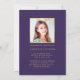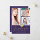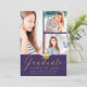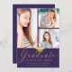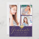 Esta moderna tarjeta de invitación de graduación con collage de fotos personalizado 4 será la elección perfecta para enviar a su familia y amigos. La parte delantera de la tarjeta contiene tres fotos para que cambies a la tuya, bordeada de púrpura. Debajo, en el moderno guión falso de oro se lee "Graduado" con el año de clase, nombre y escuela para personalizar. La parte trasera de la tarjeta tiene una cuarta foto con más detalles sobre tu graduación y planes futuros para el personalizar. ¡Felicidades por tu graduación! Diseñado por Susan Coffey.