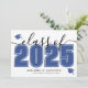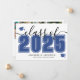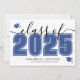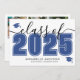 Una invitación de graduación horizontal clásica y moderna. La parte frontal presenta un "2025" sobredimensionado en azul audaz con "Clase de" en negro brillante, acentuado por un elegante guión negro. Dos iconos azules de la gorra de graduación agregan un toque de celebración, con un espacio debajo para el nombre del graduado y la escuela. Los colores se pueden personalizar para que coincidan con los colores de la escuela y tengan un aspecto personalizado. La parte de atrás muestra un collage de fotos con tres manchas de imágenes y espacio para un mensaje sincero de los padres, destacando logros y expresando orgullo.