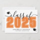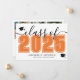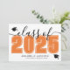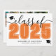 Una invitación de graduación horizontal clásica y moderna. El frontal presenta una "Clase de" sobredimensionada en negro en negrita con "2025" en un naranja llamativo para un contraste vibrante, acentuado por un elegante guión gris. Dos íconos de la gorra de graduación agregan un toque de celebración, con espacio debajo para el nombre del graduado y la escuela. Los colores se pueden personalizar para que coincidan con los colores de la escuela y tengan un aspecto personalizado. La parte de atrás muestra un collage de fotos con tres manchas de imágenes y espacio para un mensaje sincero de los padres, destacando logros y expresando orgullo.