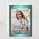 Únicas y de moda felicitaciones para graduados invitación y carta de invitación a fiesta de celebración, con un original fondo azul turquesa de color verde falso y brillante agua. Con espacio para el personalizar o personalización con una foto, el nombre del graduado, el año de graduación de clase, la escuela secundaria, el futuro nombre de la universidad o universidad, e información sobre eventos de fiestas de celebración. Que la familia, amigos y vecinos sepan que hay un feliz graduado listo para conquistar el mundo, ¡e inviten a todos a venir a celebrar el feliz evento contigo!