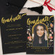 Celebre la monumental universidad de su hija o la graduación de la escuela secundaria con una impresionante tarjeta de Invitación de Arco de Foto Graduada en Flor Silvestre. Este sofisticado diseño capta la esencia de la ocasión, con una elegante caligrafía de escritura dorada en un llamativo fondo negro, bellamente complementado por un arco de acuarela de color natural. La parte delantera de la tarjeta muestra el nombre de su hija y los detalles de su graduación en la tipografía moderna de oro, mientras que la parte trasera ofrece espacio para información adicional con elegantes letras de oro modernas. La plantilla de fotos incluida permite personalizar la tarjeta con una imagen atesorada de tu graduado sin esfuerzo, creando un keepsake único. Esta carta, elaborada con obras de arte originales de la artista Catherine Sweetman, es un homenaje refinado y elegante a su logro, perfecto para compartir su hito trascendental con amigos y familia.