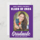 Esta moderna invitación de foto graduada de personalizado morado y blanco presenta su nombre de instituto o universidad para la clase de 2024. Personalizar con su nombre bajo la moda, escritura manuscrita en negrita para una gran tarjeta de graduación personalizada. Añade una segunda fotografía completa en la parte posterior.