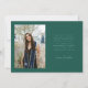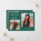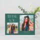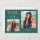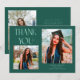 Tarjeta de anuncio de graduación moderna y caprichosa con 2 fotos en la parte frontal y 1 en la parte trasera. El texto dice "GRACIAS" con estrellas brillantes. Agregue el nombre del graduado, información y mensaje para personalizar esta tarjeta. Verde.