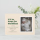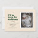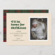 Esta invitación temática de embarazo de los Navidades incluye las palabras "Voy a ser el hogar de los Navidades" escritas en una fuente de estilo retro verde. Tiene espacio para una foto de un solo retrato así como el nombre y estadísticas de nacimiento de un recién nacido. La parte de atrás tiene un estampado rojo y verde festivo.