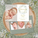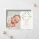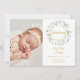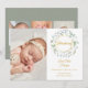 Una tarjeta de anuncio de nacimiento con guirnalda de laurel verde decorativa con una foto de su nuevo bebé. Personalice el mensaje de agradecimiento y agregue el nombre de su bebé, estadísticas de nacimiento y 3 fotos adicionales en el reverso. Diseñado por Thisisnotme©