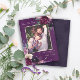 Las flores románticas en tonos de burdeos intenso, lila suave, púrpura berenjena intenso y orquídea rosada se combinan con elementos botánicos verdes modernos como helechos y eucalipto. Un fondo de acuarela de un púrpura berenjena intenso lo une todo con tipografía moderna elegante en estas tarjetas de guardar la fecha de la foto.