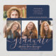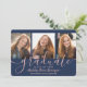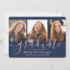 Comparte la alegría de una graduación de secundaria o universitaria con invitaciones descargables de color azul marino y rosa del collage de fotos personalizado 4. Las imágenes y todos los textos de esta plantilla digital son fáciles de personalizar con cualquier detalle de su elección, como información de invitación a fiestas, nombres de padres, honores especiales, título de grado, presupuesto inspirador favorito, información de contacto de graduados o planes para el futuro. (IMAGEN PLACEMENT TIP: Una manera fácil de centrar una foto exactamente como quieres es recortarla antes de subirla al sitio web de Zazzle.) El diseño presenta tipografía moderna, caligrafía de escritura a la moda en moda con un gorro de tablero de mortero y cuatro fotos de tu elección, como imágenes senior o de la ceremonia de inicio. Estas elegantes tarjetas de invitación de graduación son una manera elegante de compartir una celebración especial del día con la familia y amigos. ¡Felicitaciones al graduado!