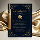 Anuncie la graduación de su hija de la secundaria o la universidad a su familia y amigos con esta elegante tarjeta de invitación formal tradicional. Este diseño de moda presenta una tapa de grad de oro falsa y un guión sobre un fondo azul marino enmarcado con un borde de falsas hojas botánicas de hiedra dorada. El texto clásico con estilo caligráfico dice "Graduate Class of 20XX" con los nombres de los padres, el nombre del graduado, la escuela, los honores y el año para personalizar Diseñado por Susan Coffey.