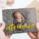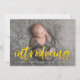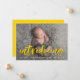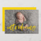 Tarjeta de presentación de fotos de nacimiento moderna que presenta la foto horizontal del recién nacido de su bebé con "presentación" mostrada en un sobreescritura de escritura de brocha amarilla. Personalice el frente de los simples anuncios de nacimiento con el nombre del bebé y las estadísticas de nacimiento. La tarjeta se invierte para mostrar un fondo amarillo sólido con espacio para fotos y texto adicionales.