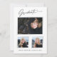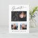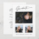Tres tarjetas de invitación de graduación de moda, modernas y elegantes, con elementos de diseño de texto moderno con escritura caligráfica de tinta. Las fotos de graduación en la parte delantera de la tarjeta se resaltan con un delicado y minimalista gradiente. La parte posterior de la tarjeta ofrece espacios de texto personalizados para obtener información sobre su graduación o puede ser borrado si desea escribir un mensaje a mano. Negro y blanco o personalizar fácilmente el fondo para que coincida con el color primario de su escuela o cualquier color de su elección. Perfecto para estudiantes de secundaria, universitarios y universitarios.